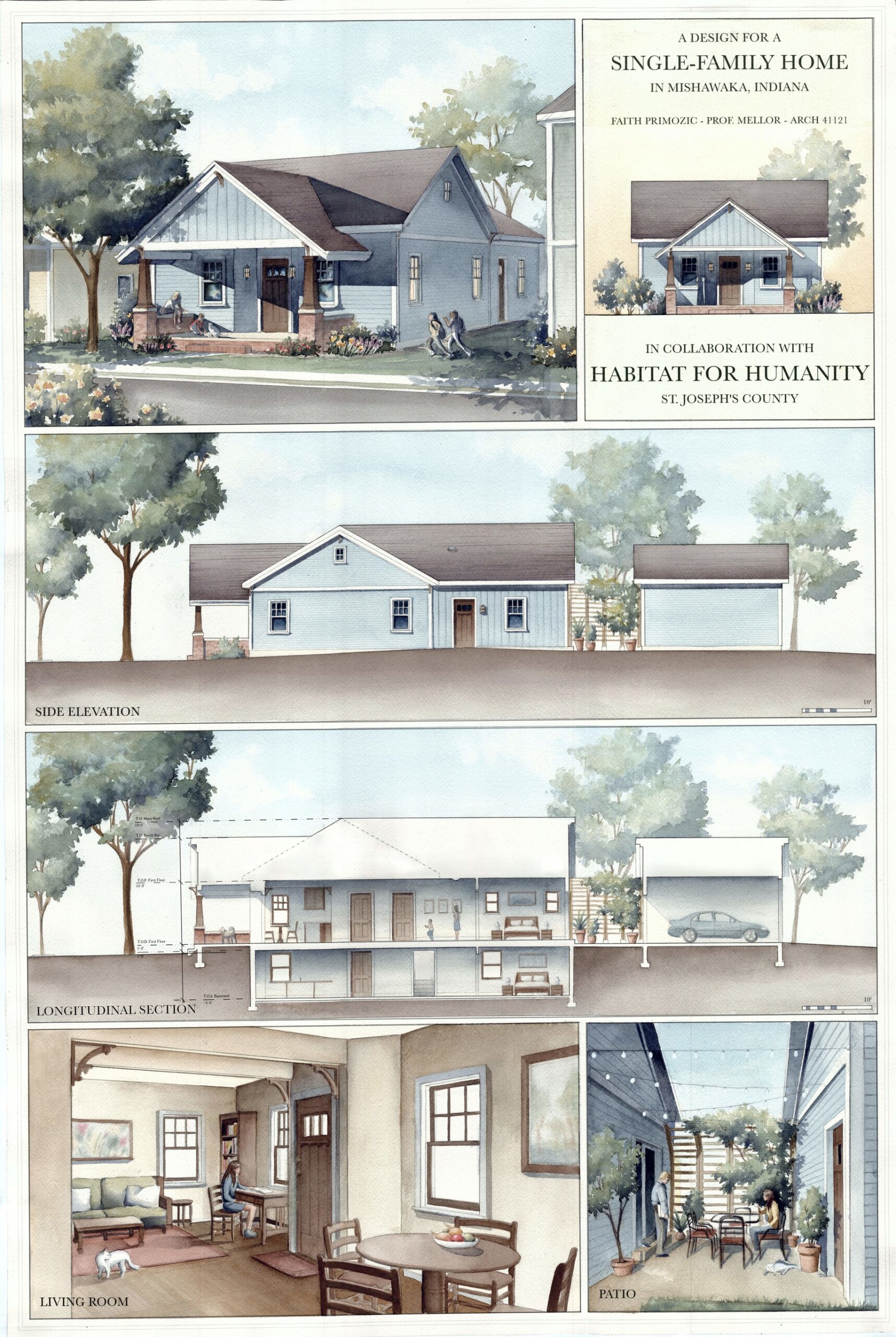 This project is a design for an affordable single-family home in Mishawaka, Indiana that was completed in collaboration with Habitat for Humanity, St. Joseph’s County. This individual design phase was followed by a group design phase with the intention of constructing the house in collaboration with Habitat in the Fall of 2021 (see below for more details).